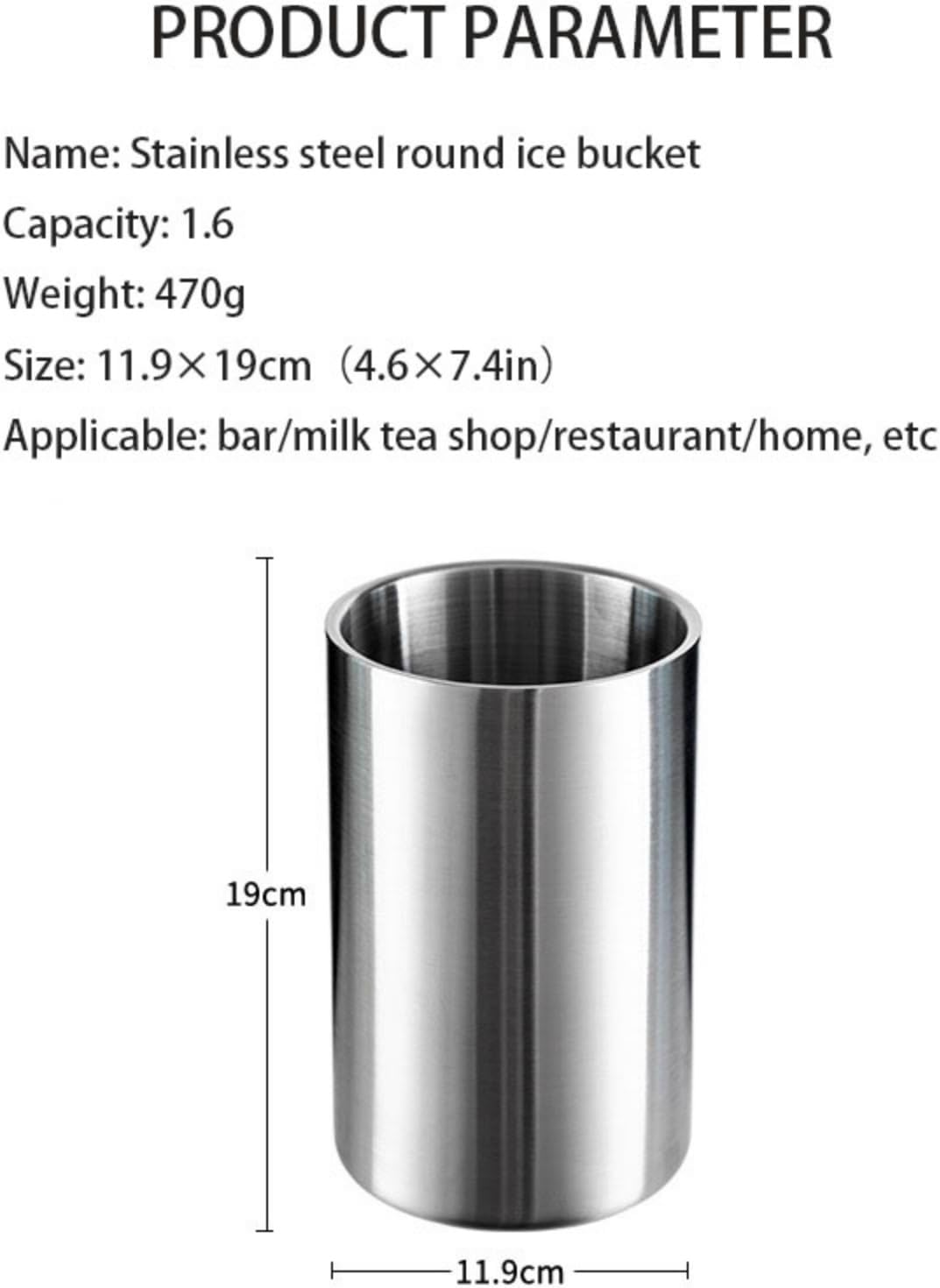 The double-layer structure is combined with the thermal insulation properties of stainless steel to preserve ice for a long time and for a long time. The ice bucket kit is rust proof, easy to clean. Material: Premium Stainless Steel Capacity: 1.6L Size: 11.9 × 19cm (4.6 × 7.4inch) Packing list:1× ice bucket It is suitable for most beer or sparkling wines as well as beer for the fastest cooling. It is easy to carry and is ideal for families, small parties, barbecues, picnics, parties, bars, clubs, restaurants and some outdoor activities.
