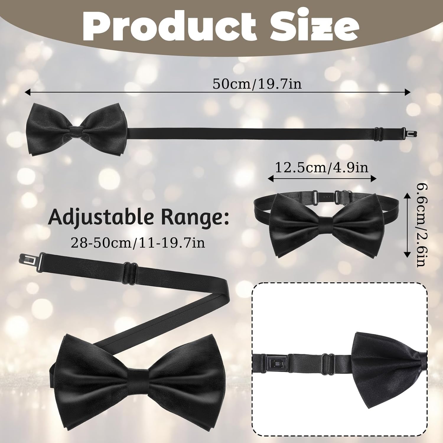 Dear customers, welcome to our store and thank you for your choice. If you are not satisfied with anything during the shopping process, please feel free to let us know and we will correct it in time and do our best to provide you with a pleasant shopping experience.Specification:Product Name: 40 Pcs Bow Ties for Men Bulk, Black Pre Tied Satin Bowtie Formal Adjustable Clip On BowMaterial: Polyester + PVCColor: BlackProduct Size:Tie Length Adjustable Range: 28-50 cm/11-19.7 inchBow Length x Width: 12.5 x 6.6 cm/4.9 x 2.6 inchPackaging: CartonPackaging Dimensions: 21 x 11 x 14 cmPackaging Weight: 447.50 gPackaging List:40 x Bow Ties for Men