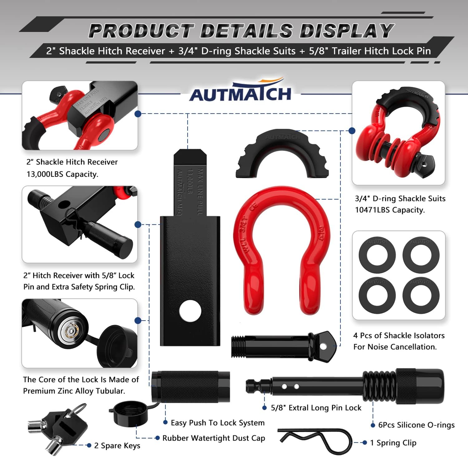 The AUTMATCH Products Shackle Hitch Receiver Set Provides Superior Towing Power and Better Grip for Meet Your Vehicle Recovery Needs and Escort for Your Travels. AUTMATCH Hitch Tightener Is Constructed From Heavy Duty Forged Steel To Prevent Wobbling, Rocking, Rattling And Hitch Movement On Hitch Mount Bike Racks, Cargo Carriers and Other Hitch Mount Towing Accessories.They are a perfect combination Our Vision Was To Create an Brave Exploration Brand That Aligns with Our Core Beliefs, A Brand You Will Resonate With and Eagerly Join In, Changing The World Around Us By Helping Support a Great Cause.