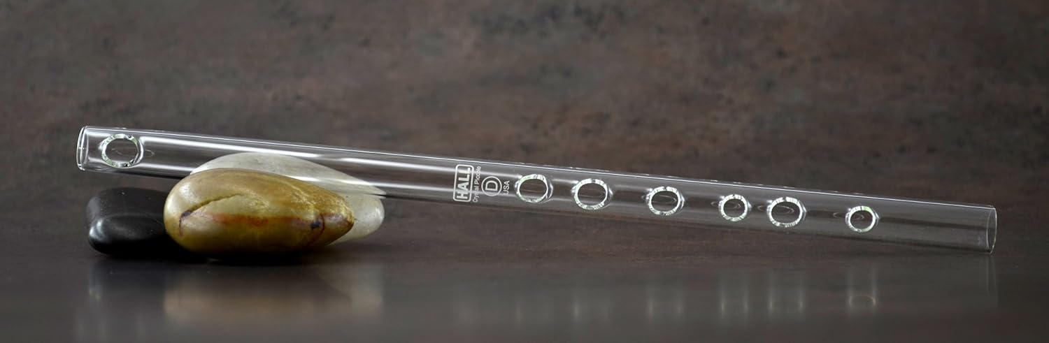 This Hall Crystal Flute is handcrafted in Washington State, USA by flute maker James Hall. Starting with precision borosilicate glass tubing, it is sealed and carefully shaped to create a Boehm taper producing beautiful and accurate tones throughout its tonal range. After shaping and tuning the tone holes, the flute is decorated and kiln fired to fuse the decorations and insure durability. Each flute is a handcrafted work of glass art. This flute will arrive nestled in a classy foam lined dark-green storage box with gold stamped logo, along with a complete fingering chart. Free sheet music is avalible on the Hall Crystal Flute website.The Hall crystal flute is a folk or historical instrument and plays differently than a modern concert flute. The mouth hole has a raised edge and no lip plate. If you play the silver flute, this will take some time to get used to. The biggest difference is that you will need to place the flute higher on the lip and use a slightly tighter embouchure. Of course you can play any style of music you wish. Being a 6-holed flute it is well-suited for playing Celtic music and traditional tunes. It is also similar in design to the renaissance or baroque flute so is excellent for this as well.11099 Inline D Piccolo - Clear GlassThe D Piccolo is our highest pitched and smallest piccolo. It makes clean crisp sounds; softer and mellower than the silver piccolo. Our Piccolos are great for small hands, for the fingering holes are placed close together making it easier to cover the tone holes. The piccolo, being a higher pitched instrument, requires a tighter embouchure then our larger flutes.Lowest Note: D5 - (one octave above middle C)Range: 2 OctavesChromatics: Yes - (Using half-holes)Primary Key : D - (no half holes necessary)Secondary Key: G - (no half holes necessary)Offset Tone Holes: No