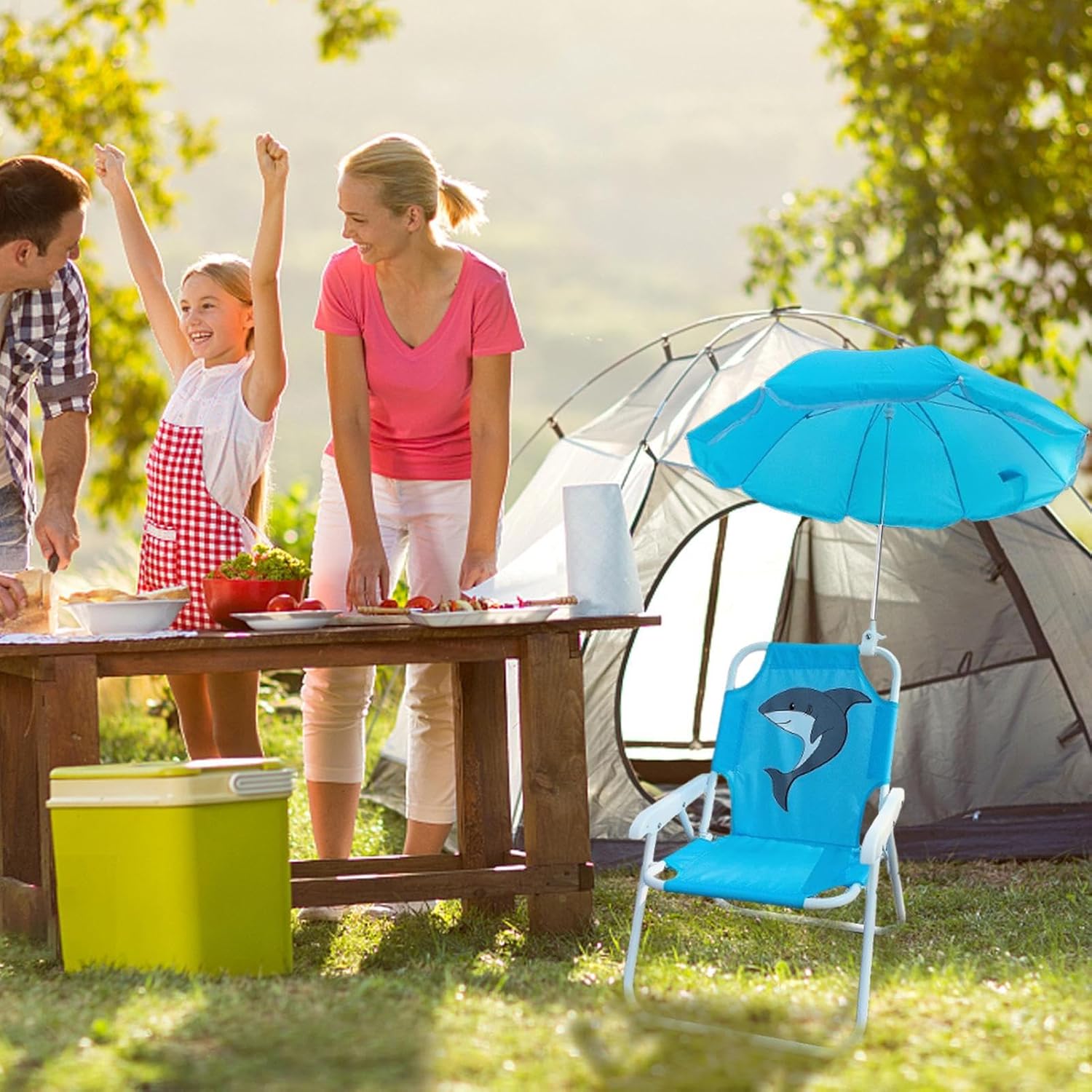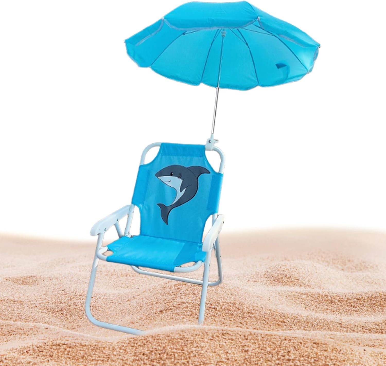 Kids Umbrella ChairKids Camping Chair with Umbrella | Beach Sand Chair with Umbrella | Wind Resistant Sand Seat with Parasol for Outdoor Travel Lawn Garden Patio Pool PicnicThis kids' beach Chair is built to withstand wear and tear, making it a reliable choice for outdoor settings. Whether at the beach, garden, patio, or poolside, the included parasol provides effective shade against wind and sun. A must-have for picnics, travel, or playtime on the sand, ensuring convenience and comfort.Specification:Name: Kids Beach Chair with UmbrellaStyle: Shark, Lion, Crocodile, Ice CreamProduct size:Chair: about 38x52cm/14.96x20.47 inchesUmbrella: about 70x50cm/27.56x19.69 inchesPacking size: about 45x38x5cm/17.72x14.96x1.97 inchesMaterial: Metal, ClothLoad: Maximum 50KGPacking List:Chair x1Umbrella x1Note:Due to different lighting and screen settings, the item color may be slightly different from the picture.Due to different manual measurements, please allow a 1-2cm difference in size.