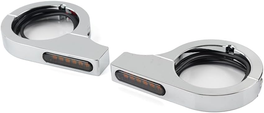 Fitment:fit motorcycle with 46mm ~ 50mm fork tubesWork for Motorcycles such as for HONDA, for Kawasaki, for Suzuki, for Yamaha and many other brands as wellIf you need other colours and sizes, please !Specification:Waterproof:Yes; Wire:2 WiresMaterial:CNC AluminumMetal Shell Color:ChromeVoltage:DC 12V; LED Lights Color:AmberPlacement on Vehicle:Front; Mounting Caliber:46mm ~ 50mmFeatures:Powered by high power 3014-SMD LED chips for amber color.Achieve a wide 360-degree illuminating effect.Waterproof special exterior material.Average lifespan of LED bulb is 30,000 working hour.Installation instructions not included. Professional Installation is Highly Recommended.Package:2x Motorcycle fork tubes LED Turn Signal 2x 0.5mm rubber pad