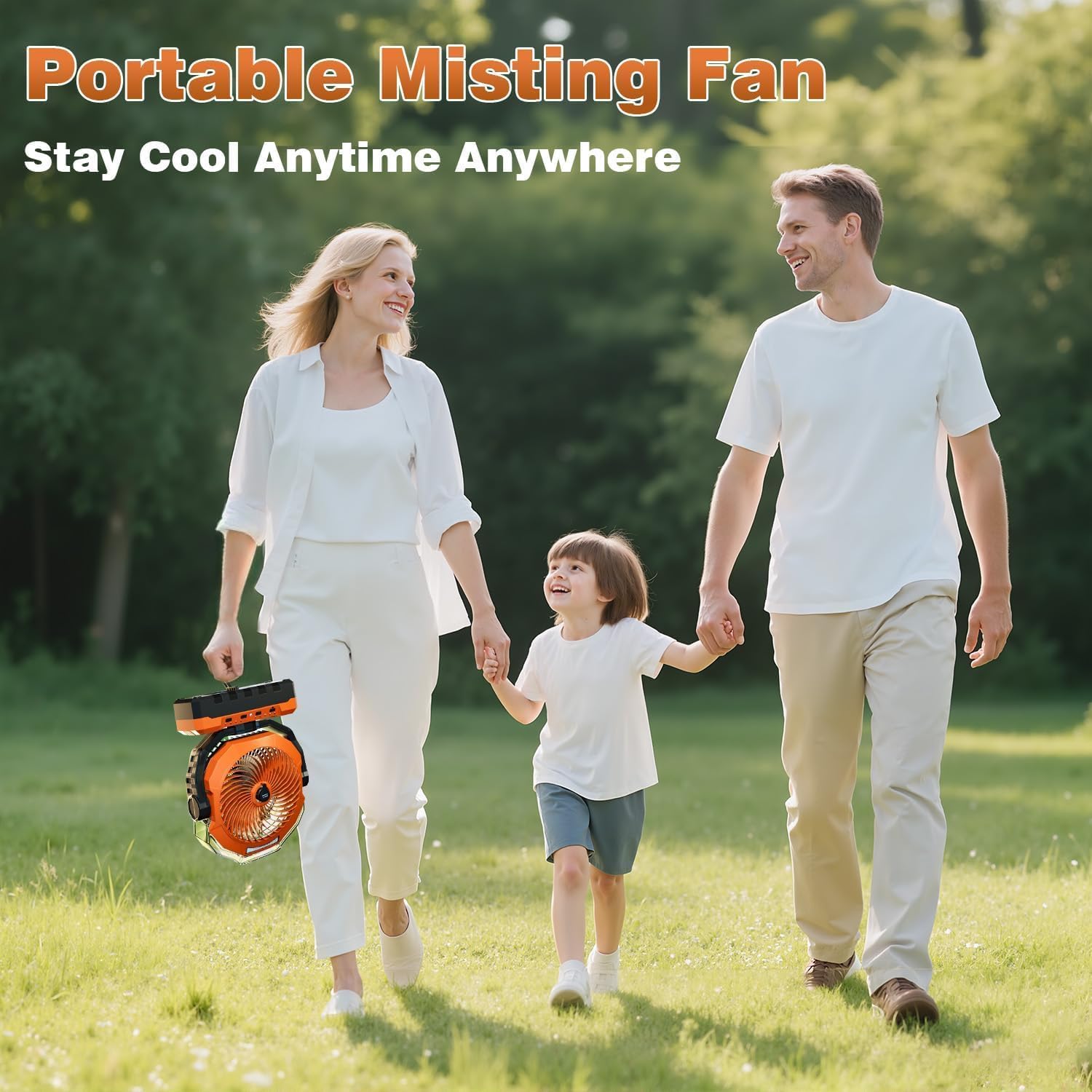 High-Capacity 24000mAh Camping Fan with Misting Function 460ml Tank, 2M Spray, Remote, Light for Beach, Patio, Summer Use