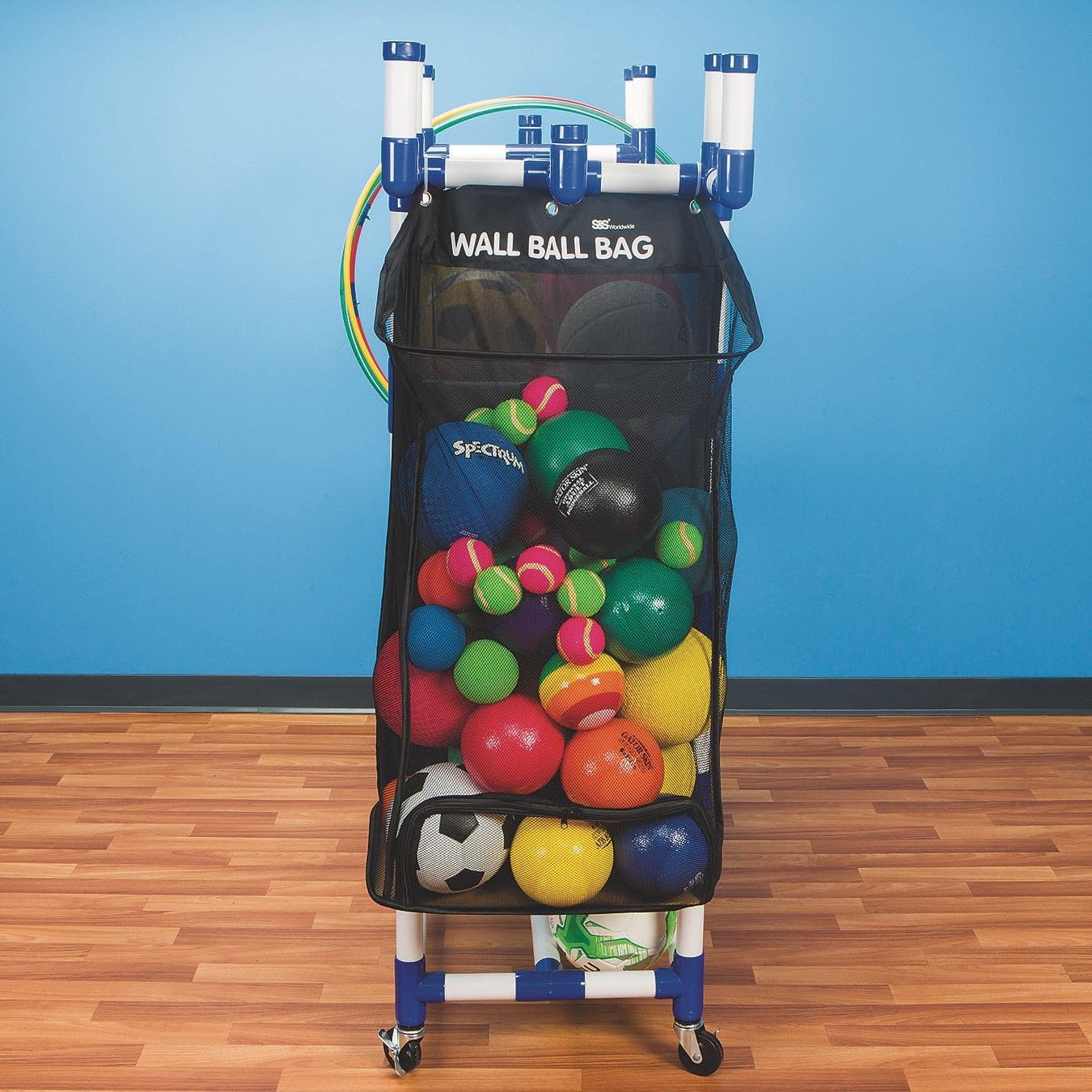 Attach this large mesh storage bag to a wall or to most PVC ball carts for added storage space wherever you need it. Great for holding smaller balls that won't fit on a cart. Bag has a 19-1/2" x 9-1/2" x 32" storage compartment (36" total length) with a large U shape 2-way zipper at the bottom for each access. Use the 3 metal grommets at the top to hang the bag from a wall with screws or attach to a cart using zip ties. Color of bag may vary.