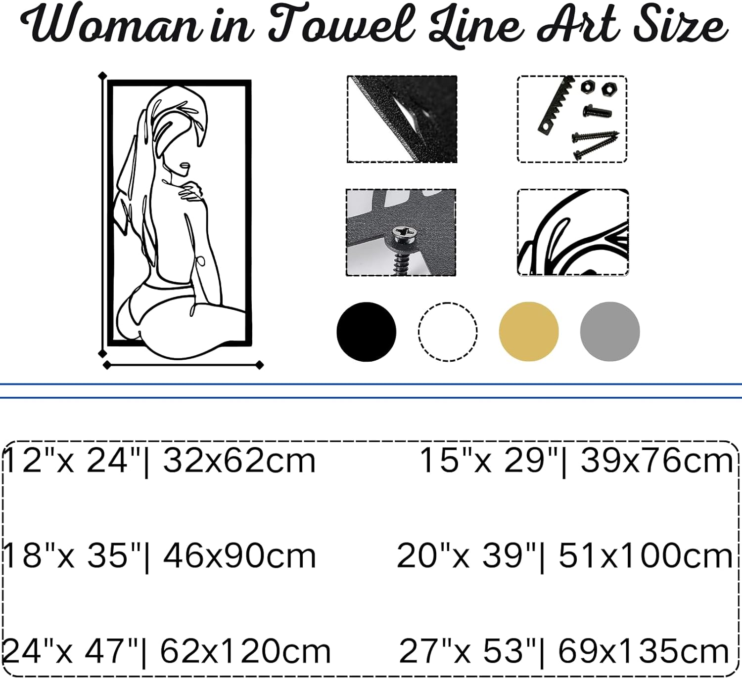 Product Introduction : This woman in towel line art is not only stylish but also functional. Made from sturdy metal, it is built to withstand the test of time, so you can enjoy it for years to come. The simple and modern design makes it an excellent addition to any decor style while the easy-to-hang design makes it convenient to install. Ideal for bathroom, this bathroom metal art wall decor is the perfect way to add a touch of elegance and sophistication to bathroom. Its minimalist design and sleek finish make it easy to pair with any color scheme, adding a touch of class and style to your home. Prodcut Specifics Material:Wrought Iron Color:Black, Gold, White, Sliver Size: 12"x 24"| 32x62cm 15"x 29"| 39x76cm 18"x 35"| 46x90cm 20"x 39"| 51x100cm 24"x 47"| 62x120cm 27"x 53"| 69x135cm 30"x 59"| 77x150cm Quantity: 1 piece Package Include: 1x metal wall decor Notes: Manual measurement, please allow slight errors in size. In summary, our minimalist metal wall line art is a versatile and elegant addition to any home. Its minimalist line art design and sleek finish make it the perfect statement piece for any room, while its high-quality construction ensures that it will last for years to come. Order yours today and elevate your home decor to the next level! Warm Tips: Please confirm the product size before placing the order, so as not to bring you unnecessary trouble (the product in the picture is the largest size). .