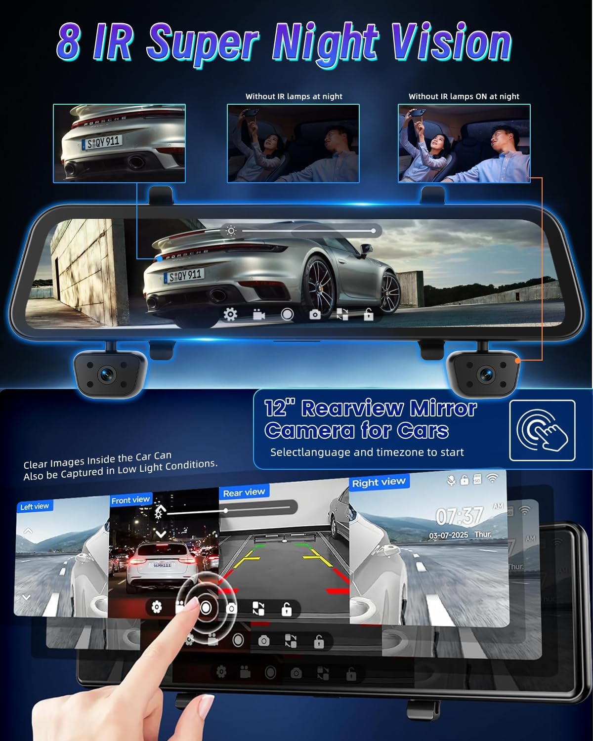 | BuiltIn Media | 12'' Mirror Dash Cam 4 Channel, 64G memory card, GPS Antenna, power cord, rear view camera |