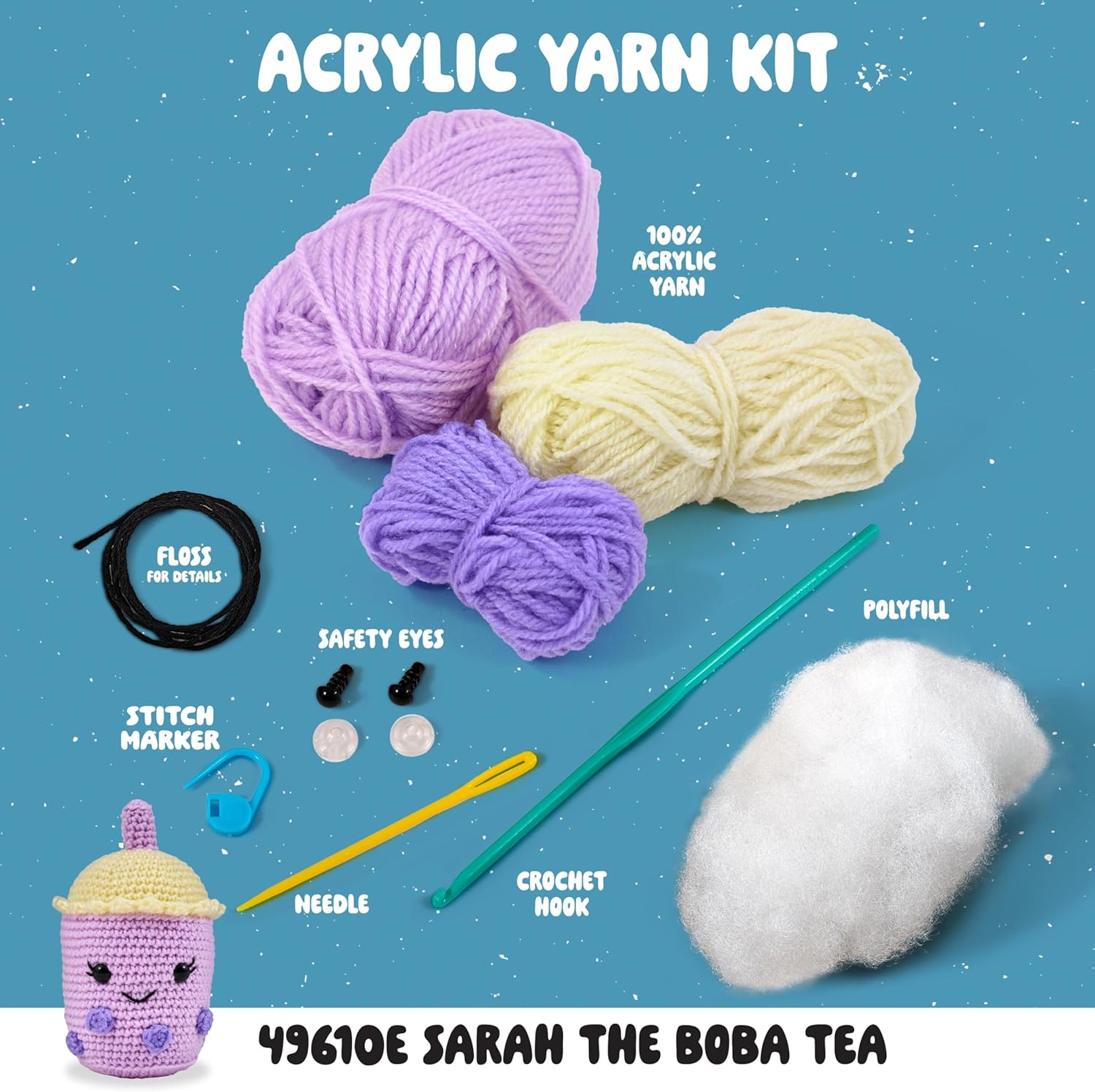 | Included Components | 100% Acrylic Yarn, Plastic Crochet Hook, Plastic Needle, Plastic Safety Eyes, Stuffing, Stitch marker, Complete written instructions, QR code with a full stitch-a-Long Video |
