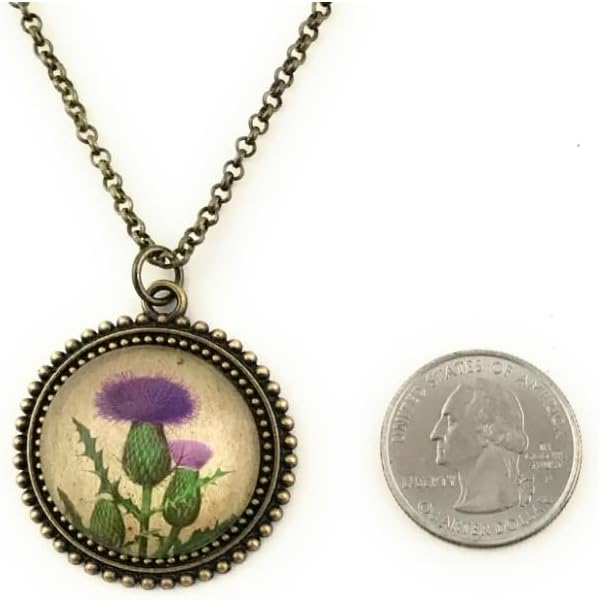 This purple Scottish thistle necklace and earring set features a vintage illustration of this flower on a natural background. Each image is placed under a glass cabochon. The necklace glass cabochon is set in an antique bronze alloy tray with a beaded edge and matching 24 inch chain. The pendant measures 1.25 x 1.25 inches. The earrings are .70 inches across - about the width of a dime - and set in an alloy brass tray. All of our items are made in upstate New York. Thank you for purchasing from a small business! Fern & Filigree donates a portion of our proceeds yearly to environmental organizations that support pollinators.