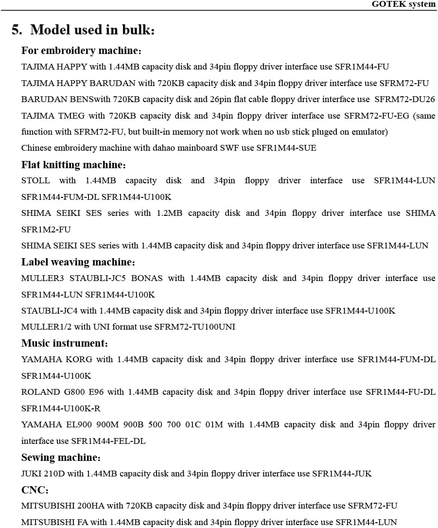 GOTEK System Floppy to USB Emulator IMPORTANT TIPS The default loaded firmware is from the GOTEK manufacturer, support 1.44M, 34pin - IBM/PC interface, the format is DOS/FAT12, and the chip is AT32F415 Cortex-M4.Please make sure your machine could support these important points. Attention in Installation Do not be reverse when installing the cable;The USB drive must be formatted into 1.44M FAT12 format , then it could be identified by our GOTEK emulator. If you would like to use our Gotek floopy emulator on AMIGA, please change our default firmware to FlashFloppy firmware first. Features: * 32-bit CPU designed, high integration, and reliable performance. * Connected to the device via the floppy drive interface, simple to install and use. * Use ordinary USB flash drive for data storage, instead of the floppy disk. * Suitable for all kinds of textiles, electronics, machinery which use floppy disk and driver. GOTEK system Floppy to USB emulator Model: SFR1M44-U100 code*: U00 Suitable Machines: Machines use normal 1.44MB floppy disk an driver, example : STOLL flat knitting machine, MULLER3 BONAS STAUBLI JC4 JC5 label weaving machine, YAMAHA KORG etc music instruments which use normal 1.44MB floppy disk and driver. Floppy driver with below function needed: Floppy driver with 34pin interface, and 5V DC power plug Use 2HD flpppy disk with 1.44MB capacity Format of disk : Cylinders: 80 Tracks: 160 Sectors/Track: 18 Bytes/Sector: 512 Data transfer rate: 500 kbps Encoding method: MFM. Features: 1.34pin floppy driver interface, 5V DC power supply, easy to install. 2.Use ordinery usb flash drive as the medium for transfer design. 3.1000pcs partitions in usb flash drive can be used. 4.Built-in self-format function. (read relevant documents to use this function) Panel: 8segment numbers: represent partitions number Green led: status of read and write operation USB port: connect usb flash drive Button Function: Left button used to rise ten-digit, right botton used to rise single-digit, press 2 button together to rise hundred-digit.