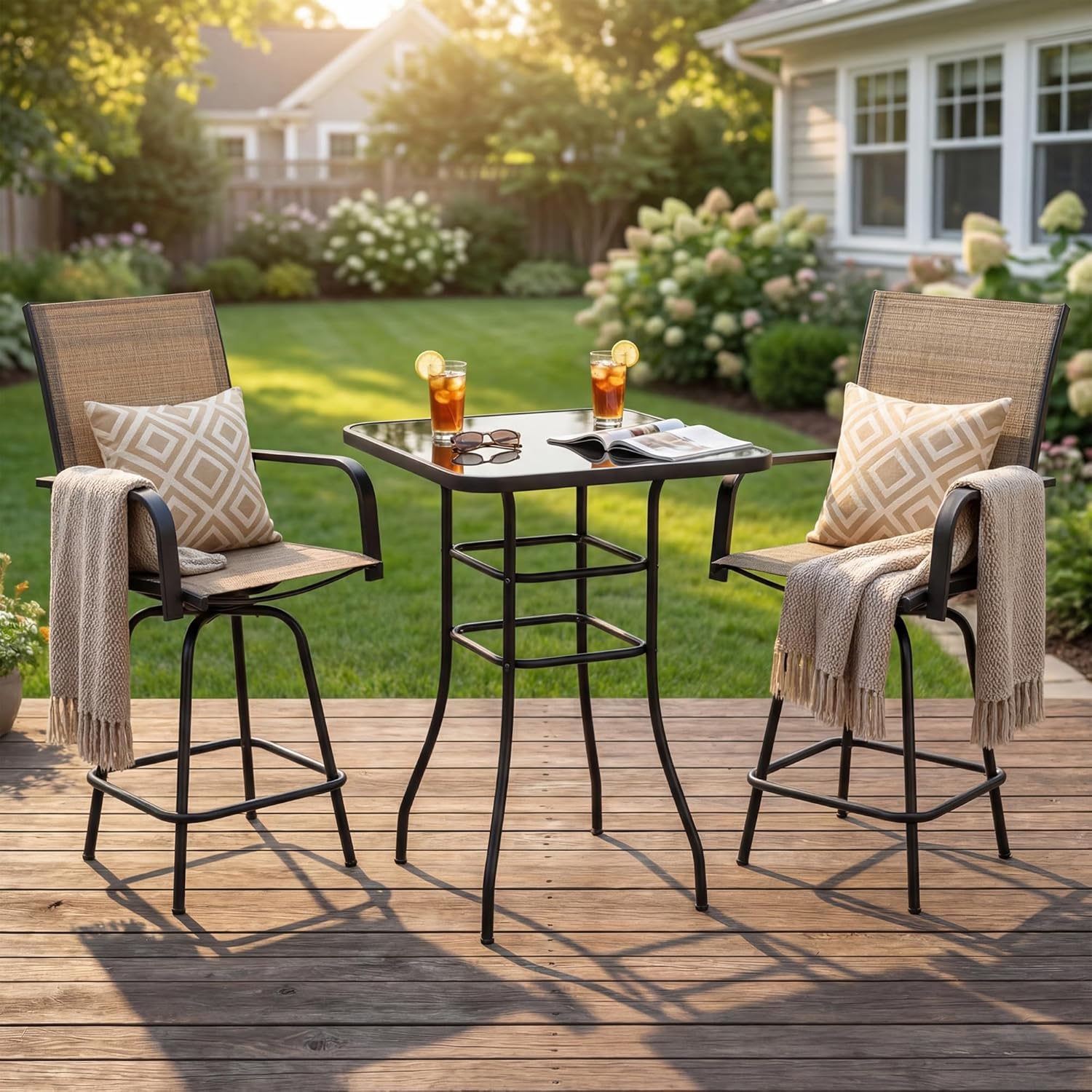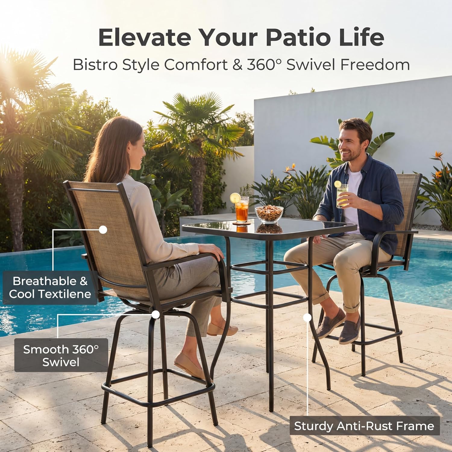 Specifications:Item DimensionsChair: 50.4" H × 19.8" W × 17.5" D (Seat Height: 28.8")Table: 39.1" H × 31.4" W × 31.2" DWeight CapacityChair: 300 lbsTable: 200 lbsMaterial: Breathable Textilene Fabric, Black Powder-Coated Steel Frame, Tempered Glass TabletopPackage Details: Ships in 2 separate boxes, which may arrive at different timesPackage Includes: 2 x Swivel Bar Stools, 1 x Tempered Glass Table, 1 x Accessory & Assembly Tools Kit