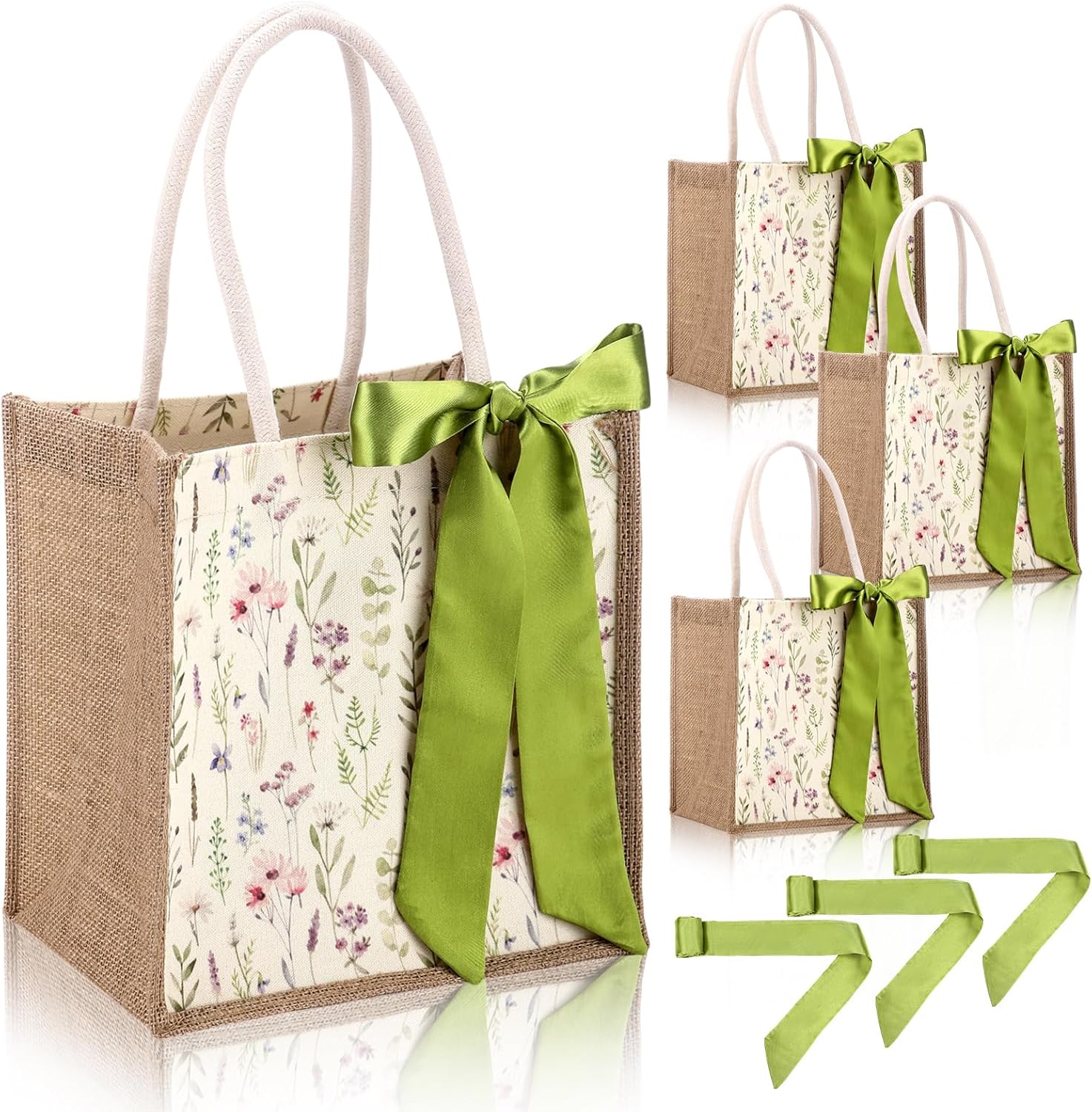 Features: The bag features jute burlap tote bags that are designed to minimize strain and increase user comfort during daily activities, whether carrying heavier items like books or groceries. This versatile burlap tote bags with handles is an ideal choice for a variety of events, including spring events, weddings, bachelorette parties, baby showers, birthdays, and more. Its beauty and practicality make it ideal for both special occasions and everyday use. Specifications: Material: jute, silk Color: green Size: Tote bag about 9.84 x 9.84 x 7.09 inches/ 25 x 25 x 18 cm Ribbon about 1.57 x 39.37 inches/ 4 x 100 cm (W x L) Package includes: Wildflower burlap Tote Bag with Ribbon Notes: Manual measurement, please allow slight errors on size. The color may exist a slight difference due to different screen displays.