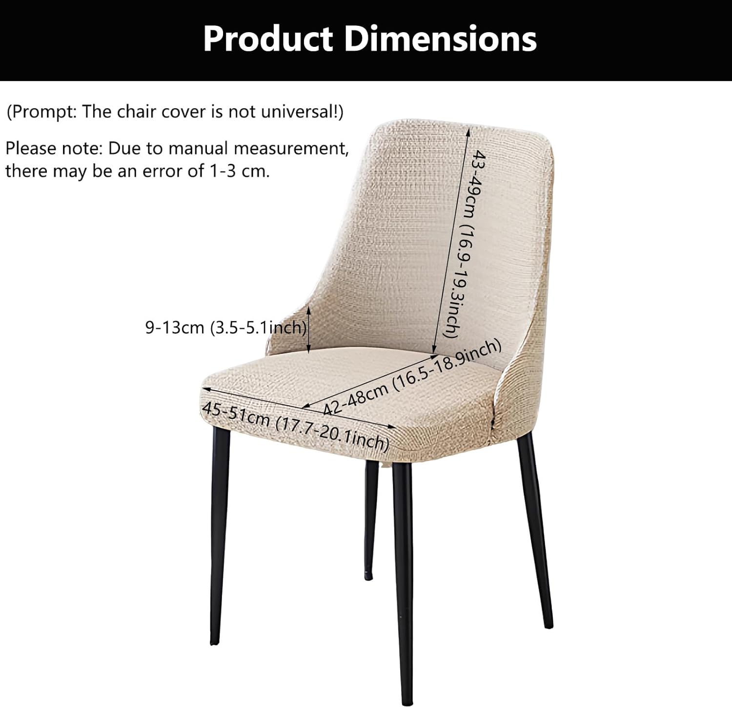 ---Does the ordinary chair cover not fit?---Are you looking for "Curved Armchair Cover"?---Do you still use your old chair every day?- low cost restaurant stretch velvet wingback chair covers with arms can refresh your old chairs, give your new chair full protection, extend the life of the chairs and help you save money- It can give your old or ugly wingback chair a fresh look. Protect your wingback chair from scratchesand damage.Very easy to install and removeSPECIFICATION:NAME: Curved Back chair coverStyle: modern and simpleMaterial: Polyester + Spandex FabricColor: Beige, Khaki, Light Gray, Dark Gray, BrownItem Weight: About 260g (Quantity 1pc)Applicable Seasons: All Seasons- Chair cover universal sizeBackrest Height: 43-49cm (16.9-19.3inch)Seat Width: 45-51cm (17.7-20.1inch)Seat Depth: 42-48cm (16.5-18.9inch)Armrest Height: 9-13cm (3.5-5.1inch)- Please measure your chair before ordering.INCLUDES:2/4/6 Dining Chair Covers, (chair not included)PLEASE NOTE1. Due to manual measurement, the difference is 1-3 cm2. Please note that due to the influence of light and screen, there may be slight chromatic aberration.