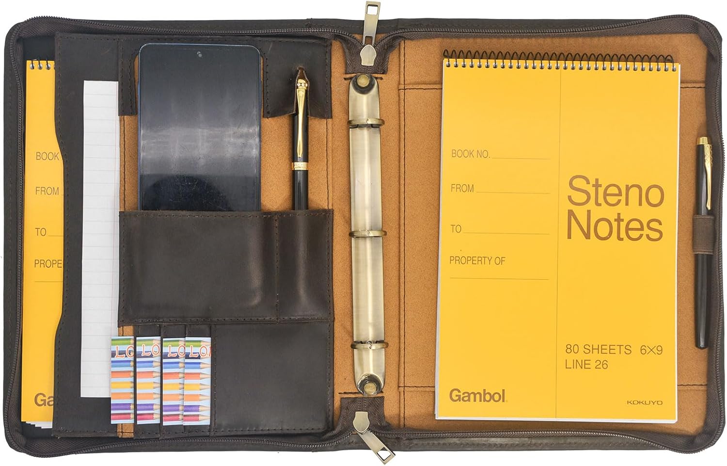 Pull together everything you need in one organized case. This Zipper Organizer Binder Portfolio is made to take you through your work day from meeting to meeting in style. The inside features a 3-ring binder to hold junior legal (half of letter) / A5 paper, and the notepad holder holds a A5 (up to 6 by 9 inch) notepad. Tuck you business cards, lucky pen, cellphone and all of your other essentials into organizer panels. With tons of pockets inside and out, there's a place for everything. The Leather Padfolio zips closed when you're ready to pack up. (Device and accessories are not included.)Notes: Notepad, Tablet, and accessories are not included. Due to the light and screen setting difference, the item's color may be slightly different from the pictures. Please allow a slight dimension difference due to different manual measurements. Warm Tip: This product is made from Crazy Horse Leather. The distinguishing feature of Crazy Horse Leather is some wrinkles, scars, and scratches on the surface. So it can present the style of retro and wildness. When you scrape it widely, the trace will appear. The marks, worn seams, and traveled look age with the bag to create an even more attractive version than the first time it's used. If the trace is not obvious, you can wipe it gently, then the trace will be less. Please pay attention to this feature before you decide to purchase.